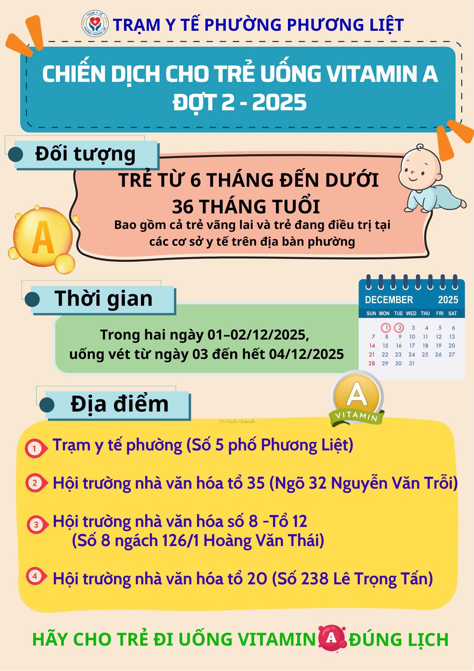 Thông báo: Trạm Y tế phường Phương Liệt triển khai chiến dịch uống bổ sung Vitamin A đợt 2 năm 2025