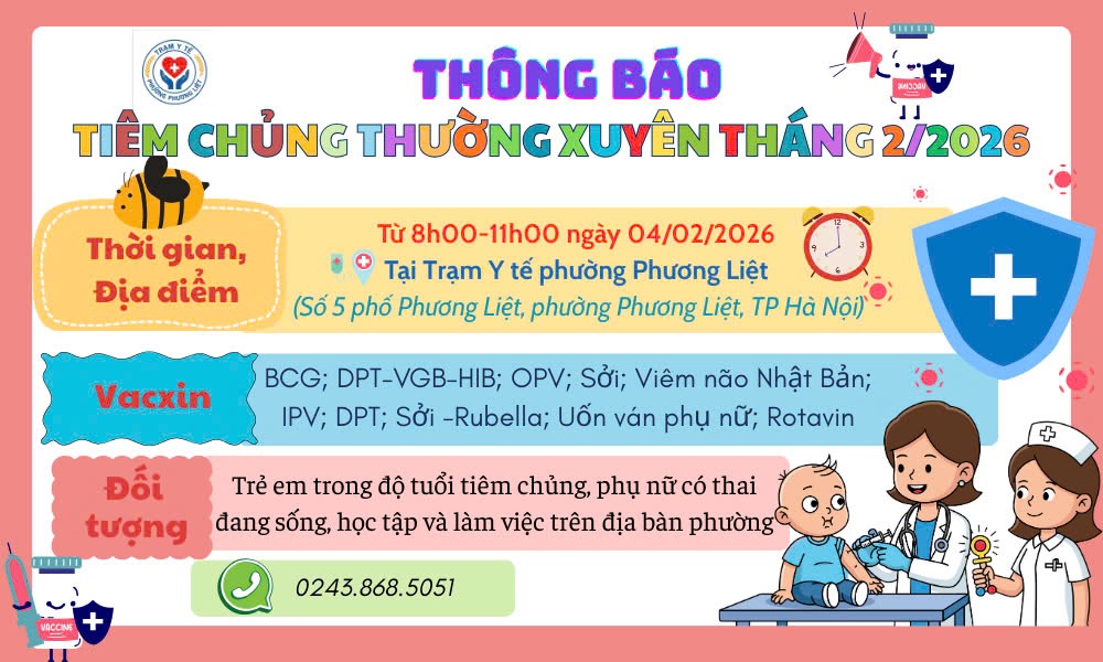 TRẠM Y TẾ PHƯỜNG PHƯƠNG LIỆT THÔNG BÁO LỊCH TIÊM CHỦNG THÁNG 1 NĂM 2026