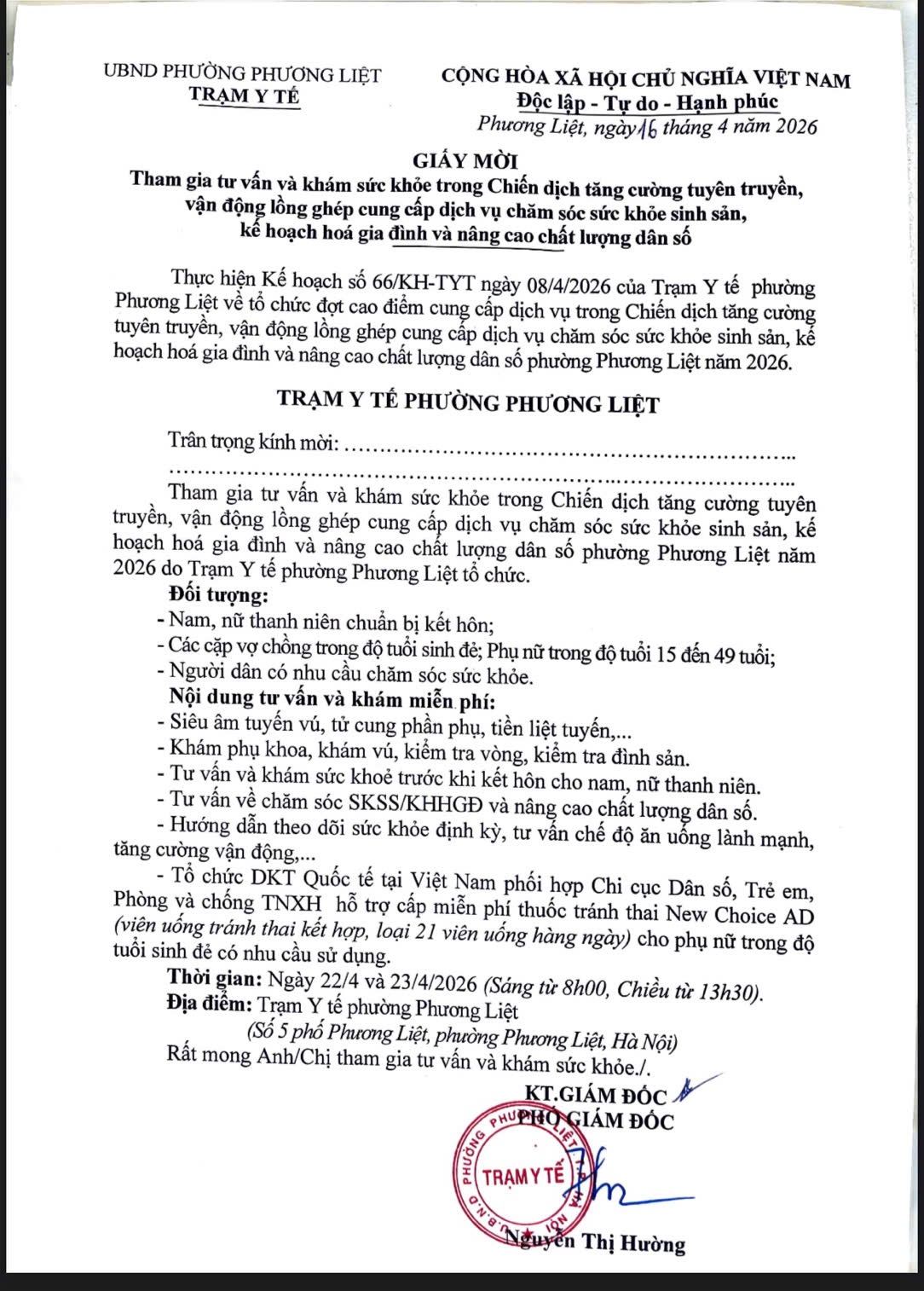 Phường Phương Liệt tổ chức chiến dịch truyền thông lồng ghép CSSKSS/KHHGĐ năm 2026 Ngày đăng 17 Tháng 4, 2026 bởi tramytephuongliet