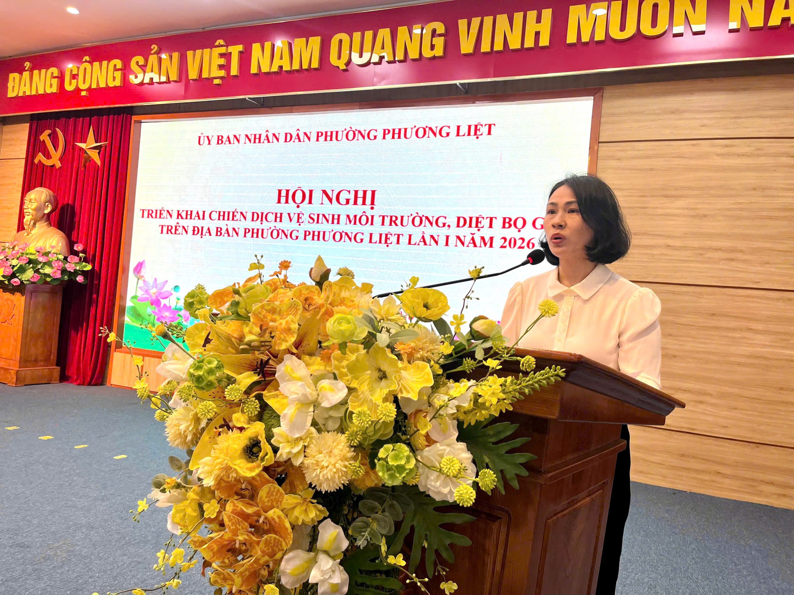 Phát biểu tại Hội nghị, đồng chí Đặng Thị Thanh Hà đã phát động Chiến dịch vệ sinh môi trường, diệt bọ gậy và huy động sự vào cuộc đồng bộ của cả hệ thống chính trị và nhân dân trên địa bàn phường. Mỗi hành động nhỏ hôm nay như úp bỏ một dụng cụ chứa nước, vệ sinh một góc vườn… chính là góp phần bảo vệ sức khỏe bản thân, gia đình và cộng đồng, xây dựng Phương Liệt luôn là phường sáng – xanh – sạch – đẹp. Thông điệp đồng chí gửi đến các đại biểu dự Hội nghị ‘‘Không có bọ gậy, không có sốt xuất huyết”.